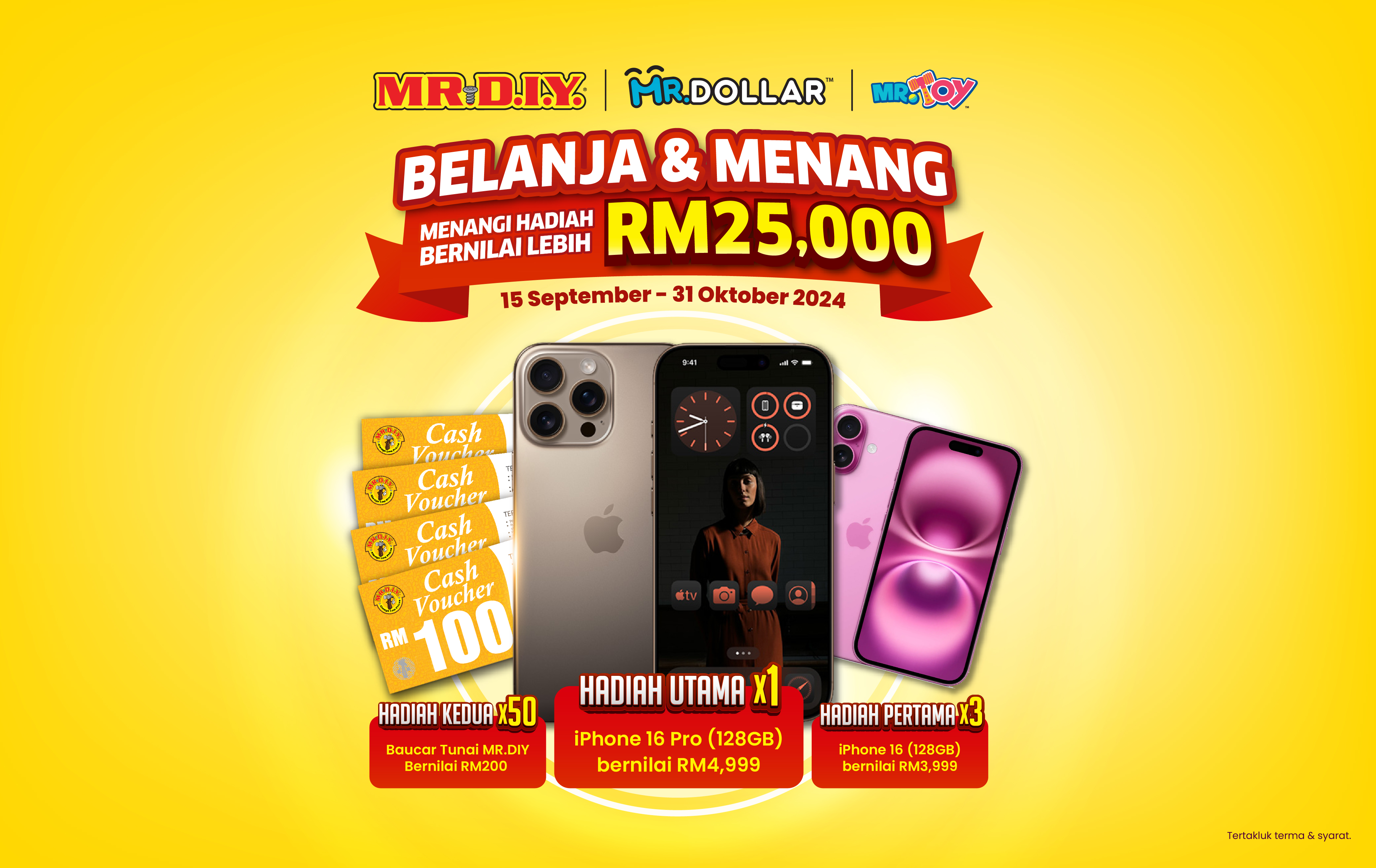 Berpeluang memenangi iPhone 16 yang baru dilancarkan! Dengan hadiah bernilai lebih RM25,000 untuk dimenangi, inilah masanya untuk berbelanja dan bawa pulang hadiah impian anda.